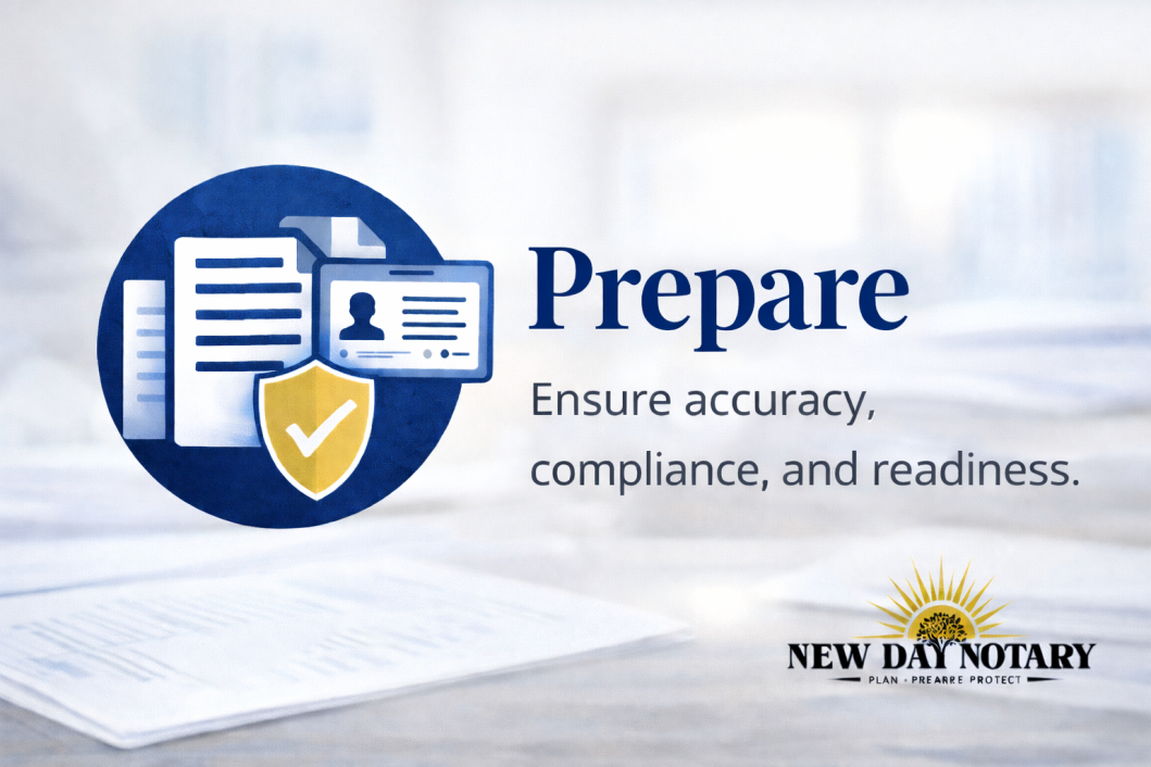 New Day Notary is here to guide you through every step—ensuring your documents are prepared correctly, processed efficiently, and handled with care.